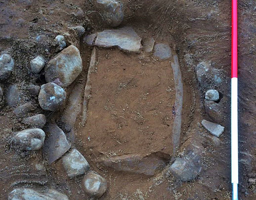 It was covered by a large sandstone capping stone and, although soil had filled the grave, excavation revealed that it contained a single beaker pot, placed inside as an offering at the time of burial.